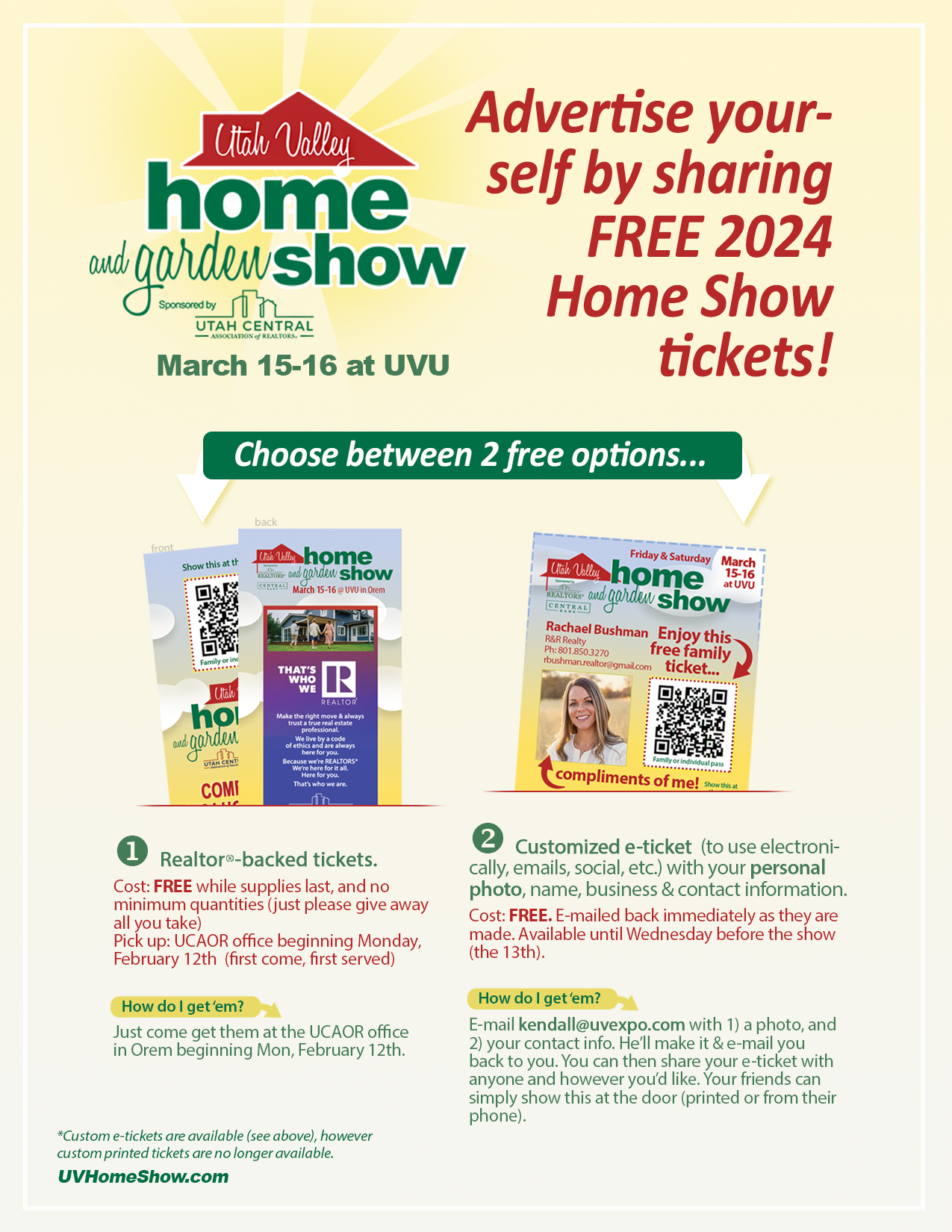 Show marketing includes a media-wide campaign again this year. A key marketing piece is our custom pre-Expo Home Show Guide that we mail out to 86% of single family homes in Utah County! Of course our other marketing efforts still include I-15 billboards, magazines, extensive social media campaigns, retail ticket distribution points, independent ticket mailings, promoted social media and a hand delivered ticket route to the county's main retail centers. We also have awesome help from our REALTOR friends who have traditionally delivered more than 90,000 tickets out to friends in our region.